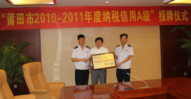 根據(jù)國家稅務(wù)總局《納稅信用等級評定管理試行辦法》的文件精神,經(jīng)過莆田市國家稅務(wù)局、莆田市地稅局聯(lián)合評選、市評定辦公室審核、公示等一系列程序,莆田燃?xì)夤煞萦邢薰驹?A name=baidusnap0>納稅信用等級評定中表現(xiàn)突出,被授予“2010-2011年度納稅信用等級A級納稅人”榮譽(yù)稱號。
